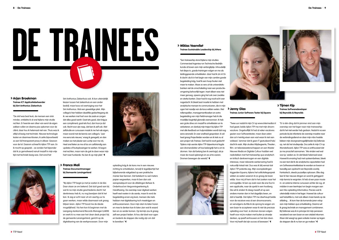 Negen enthousiaste young professionals vertelden me voor TTP Next, het magazine van Ajilon TTP, over hun dromen. Alle negen waren het trainees met een bijzondere achtergrond, die door lef en ongewone keuzes de baan van hun dromen vonden. Makkelijk was het niet altijd, maar het resultaat mocht er voor alle negen zijn. Zoals een trainee het verwoordde: ‘Dromen bewegen de wereld. Als je maar de moed opbrengt om je dromen ook uit te voeren.’ Een mooie klus, die ik in opdracht van advies- en ontwerpbureau Noordwest12 uitvoerde.